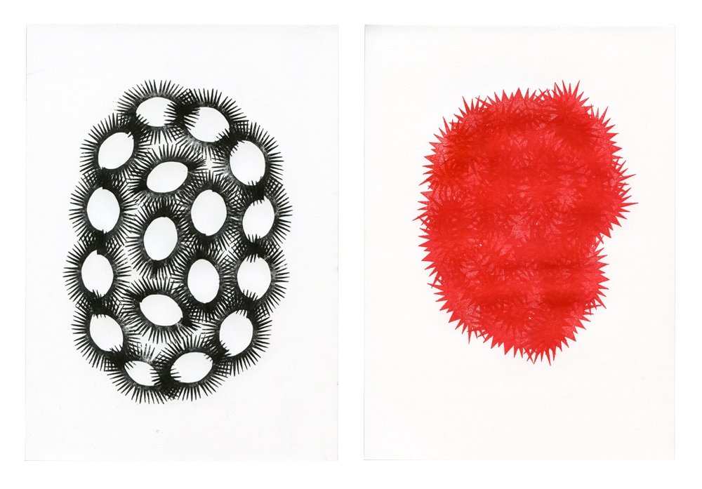 Da più di 10 anni Gianpaolo Pagni ha fatto del timbro un elemento di creazione ricorrente nel suo lavoro. I timbri che utilizza come degli utensili, gli permettono di disegnare nella moltiplicazione del gesto e del segno. Li crea specialmente per ciascuna nuova serie di disegni che intraprende, un po’ come se scegliesse il suo vocabolario, stabilendo una lista di parole prima di scrivere un romanzo. Ma piuttosto che un romanzo, il suo ultimo libro, No body, composto da 137 disegni al timbro somiglianti a una lista di sentimenti, oggetti, cose, persone, luoghi, compone un corpus intellegibile ma anche fragile.